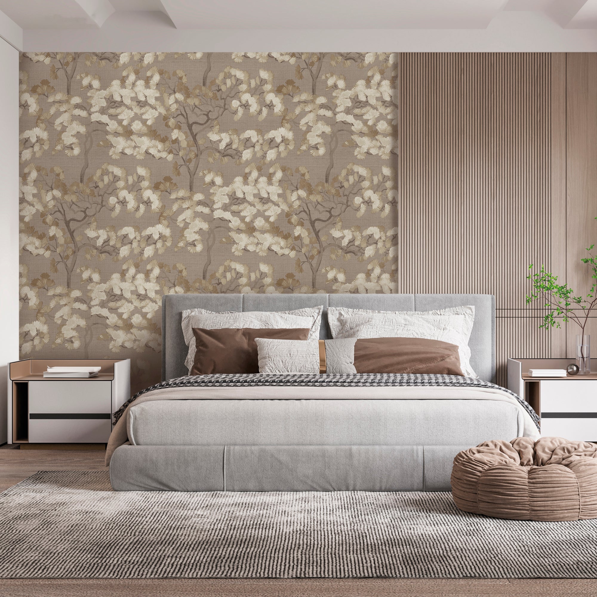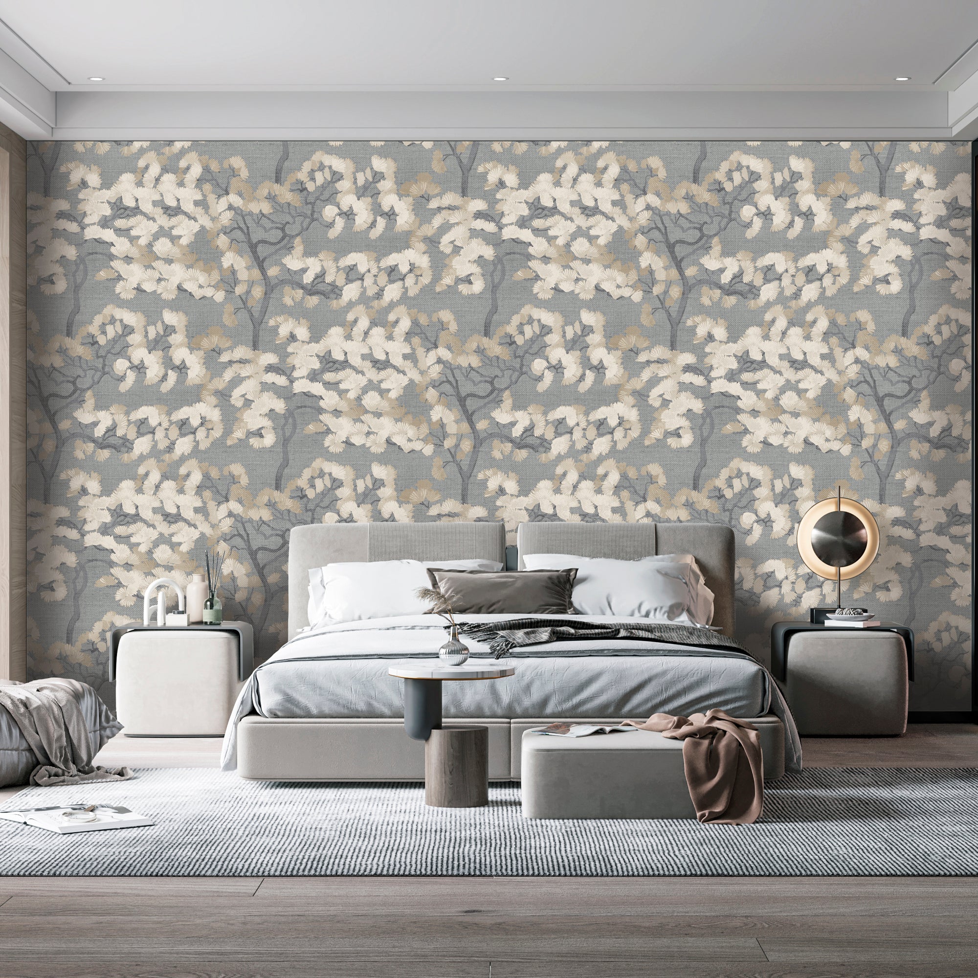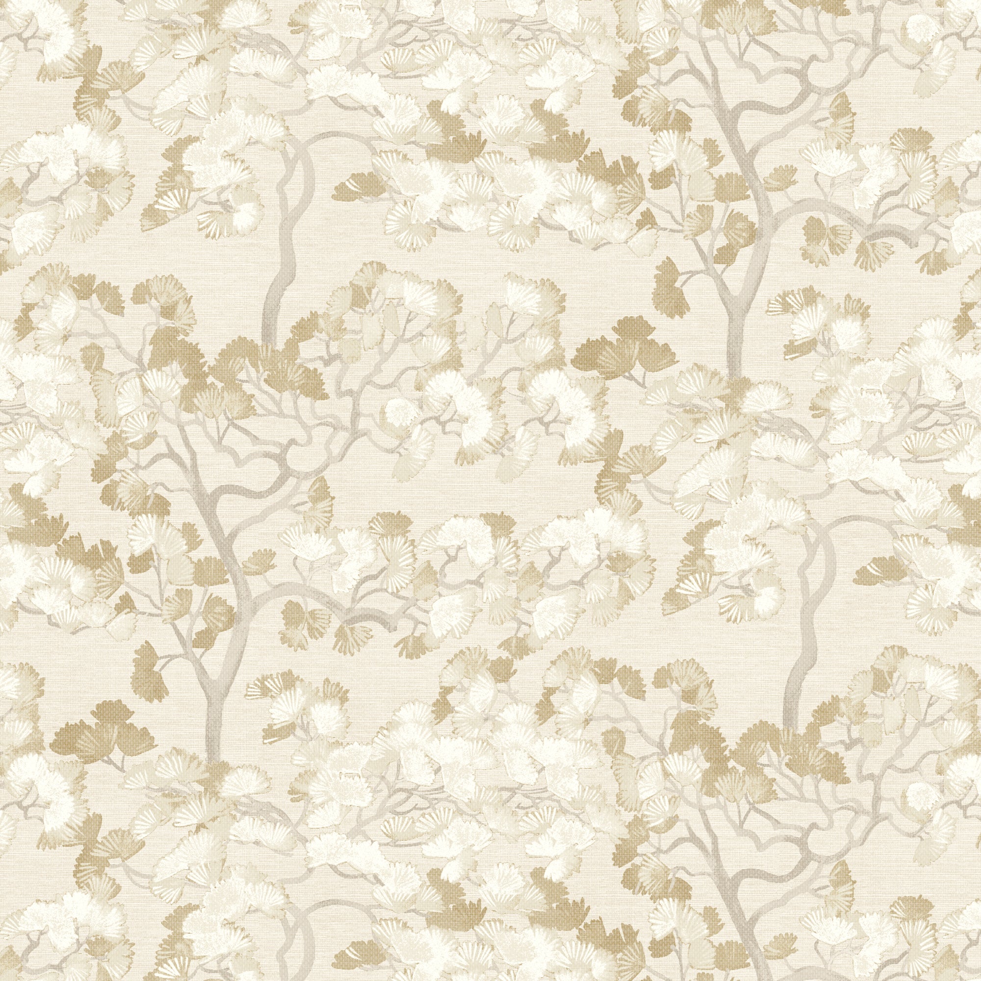 A statement-making wallcovering featuring a large-scale ginkgo motif set against a richly textured faux grasscloth ground.