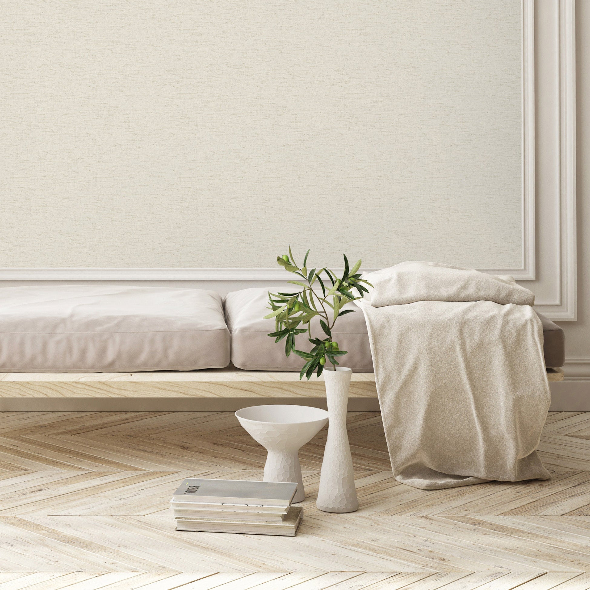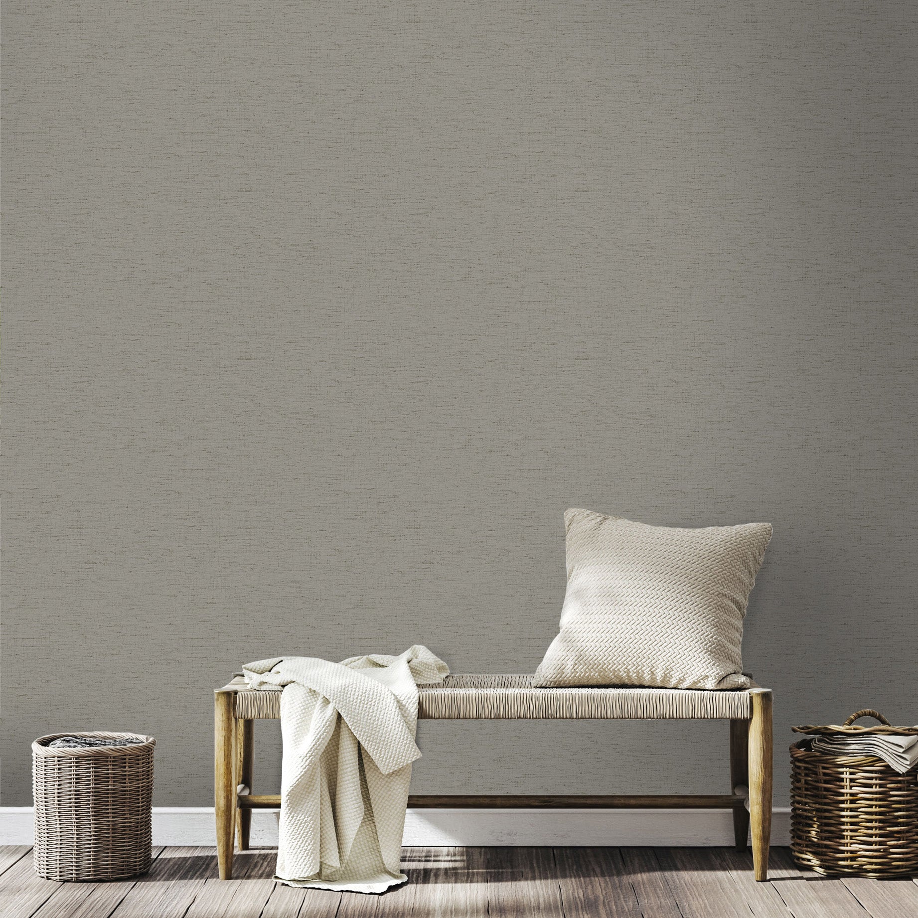 A refined linen-look wallpaper enhanced with natural flecks brings warmth, softness, and organic charm to any interior. Perfect for a serene, elevated backdrop.